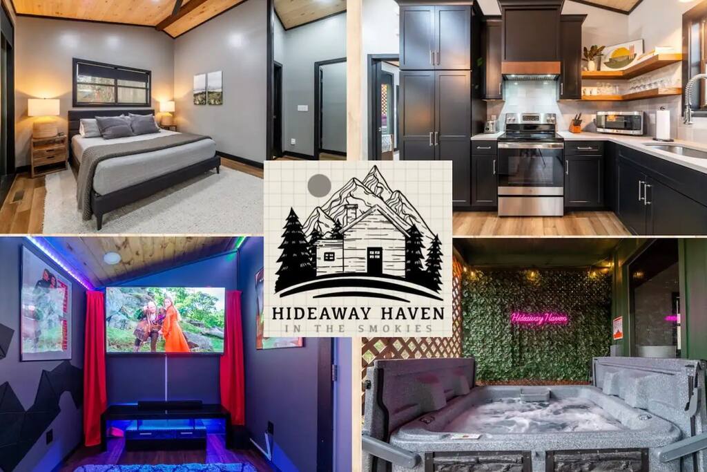 Welcome to Hideaway Haven, your perfect couple's retreat, tucked into the enchanting wooded landscape. This 1B/1B cabin combines rustic elements with modern comforts, offering a luxurious escape. Whether it's lounging in the private hot tub or enjoying a movie night in theater room, this home promises relaxation. Located just 16 miles from Gatlinburg and the Smoky Mountains, you're both close to adventure and immersed in tranquility. Experience a getaway like no other and book your slice of paradise today! KEY FEATURES: ✔Cozy open-concept living space with fireplace ✔Sleek, fully-equipped kitchen with all essentials and appliances ✔Inviting king-sized bed with soft, luxurious bedding ✔Modern bathroom with a refreshing walk-in shower (shampoo, conditioner, and body wash provided) ✔Outdoor deck featuring a soothing hot tub and seating ✔Private detached movie theater with large TV and seating ✔Expansive yard with a charming swing overlooking the creek ✔BBQ grill, fire pit and cornhole for your outdoor activities LOCATION: *16 Miles to Downtown Gatlinburg *23 Miles to Pigeon Forge *18 Miles to the entrance of Smoky Mountain National Park **Please Note** ▪️Starter essentials have been provided for you (1 roll of toilet paper, 1 roll of paper towels, hand soap, dish soap, dishwasher pods, coffee, and tea) ▪️Bring propane for the BBQ grill; we are unable to monitor propane tanks left at the cabin ▪️Smart TVs are equipped with streaming apps; bring your own login and password **Neighborhood** Nestled in a serene wooded area, Hideaway Haven places you near fantastic attractions without hindering your peace. Spend a day exploring Gatlinburg, Pigeon Forge, or hiking in the magnificent Smoky Mountains. Afterward, retreat back to your cabin to unwind beneath the stars or enjoy a movie night in the theater room. Embrace the best of both worlds—adventure and relaxation—right here in your mountain escape.